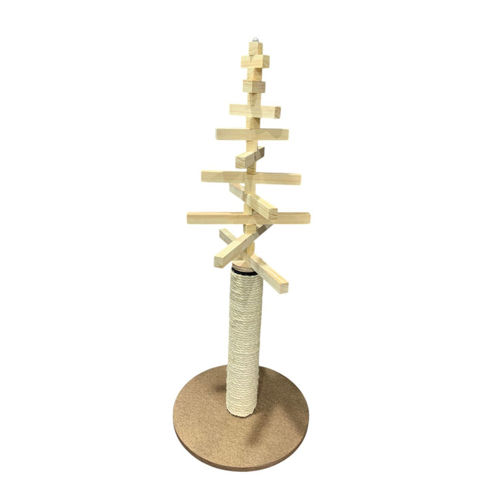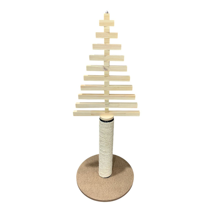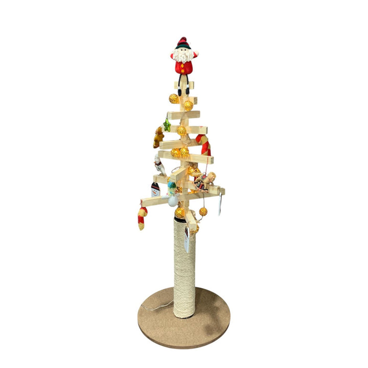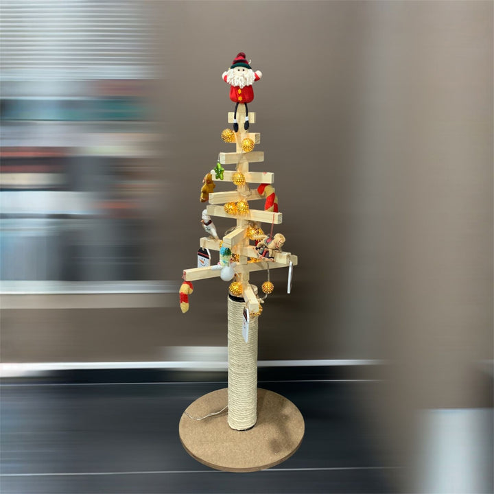 Arbolito de Navidad con rascador integrado, compuesto por palitos de madera independientes que pueden acomodarse libremente para crear el diseño navideño que más te guste. Su altura total es de 1 metro. Incluye un poste rascador de 50 cm recubierto con cabuya natural de 10 mm, sostenido por una base de madera aglomerada de alta densidad. Es fácil de decorar con luces y adornos (no incluidos) y su estilo minimalista se adapta a cualquier hogar. Tiempo de entrega: 2–3 días hábiles.