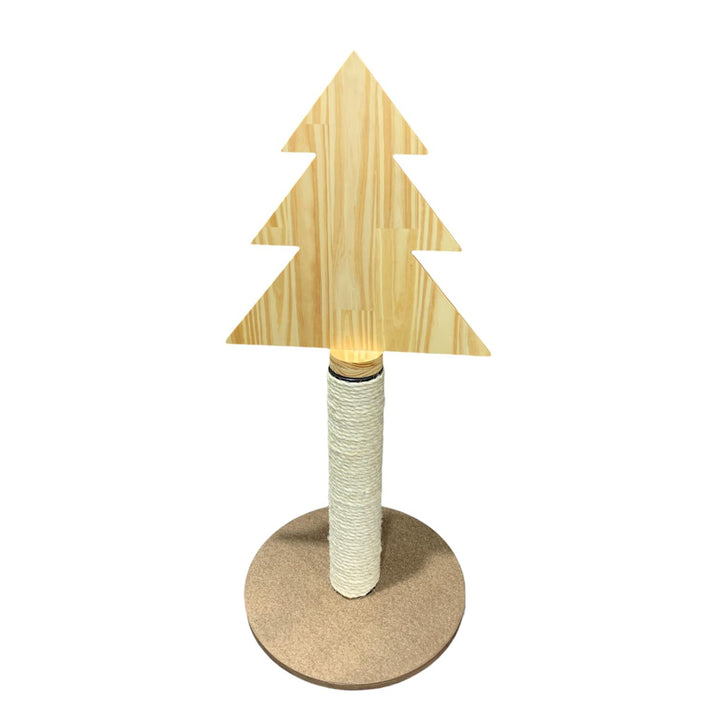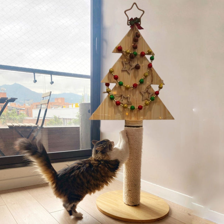 Arbolito de Navidad con rascador integrado, diseñado en forma de pino y fabricado en madera de pino maciza. Incluye un poste rascador de 50 cm recubierto con cabuya natural de 10 mm, montado sobre una base de madera aglomerada de alta densidad. Es fácil de decorar con luces y adornos (no incluidos) y mantiene una estética minimalista que se integra en cualquier hogar. Tiempo de entrega: 2–3 días hábiles.