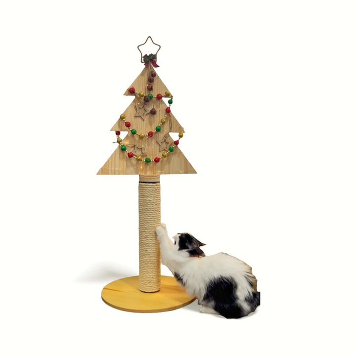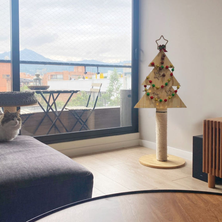 Porque te permite disfrutar de la decoración navideña sin preocuparte de que tu gato destruya el arbolito. Al contrario, lo disfrutará gracias al poste rascador. Además, al terminar la temporada, puede usarse como un rascador independiente, estable y funcional. Su diseño minimalista y versátil lo hace perfecto para cualquier espacio del hogar.