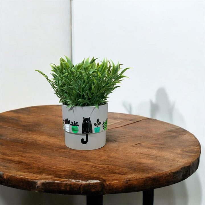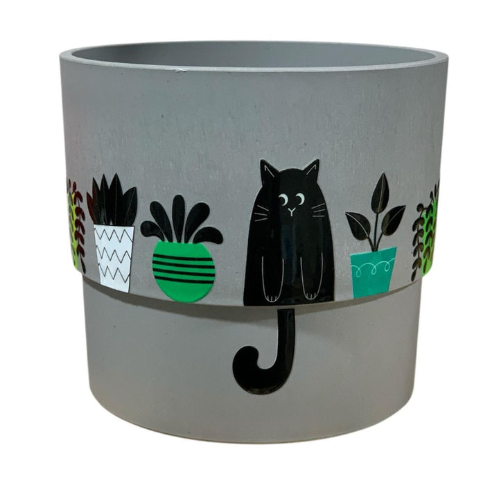 La Matera Gris es una maceta decorativa de 9 cm de alto en un suave color gris claro, con una apariencia similar al cemento. Su diseño moderno y encantador presenta una banda ilustrada en la parte superior que combina plantas en macetas de distintos estilos con un simpático gato negro, agregando un toque artístico y acogedor a cualquier ambiente.